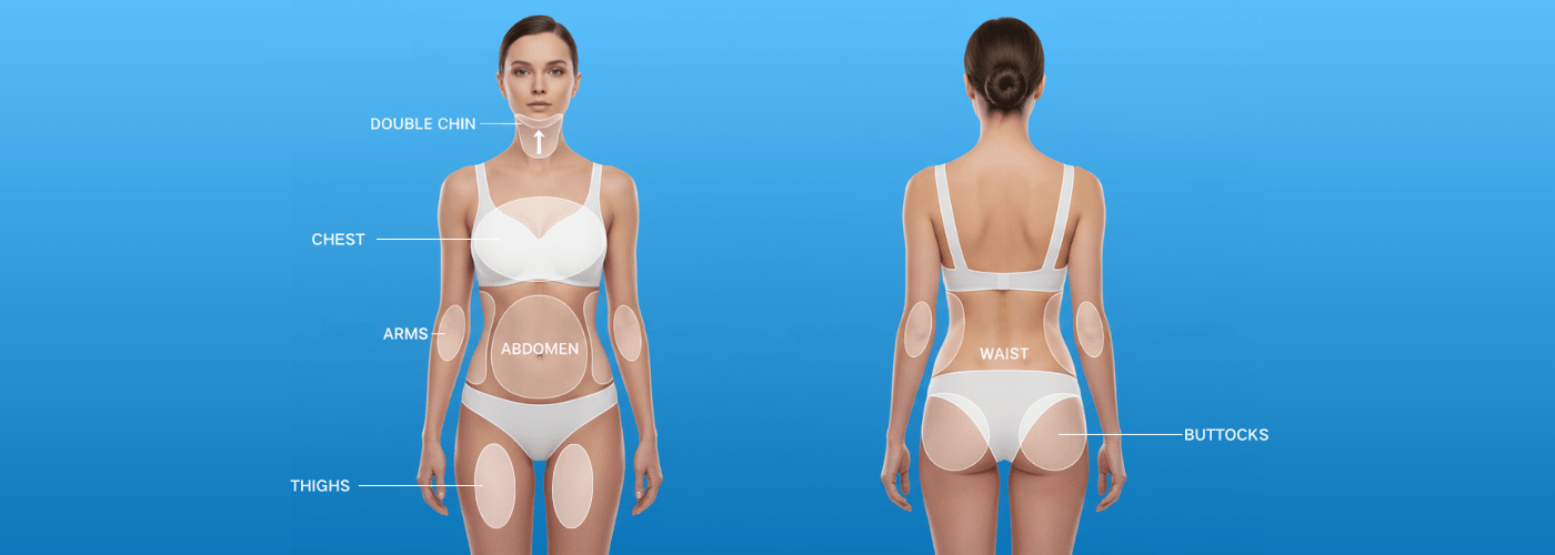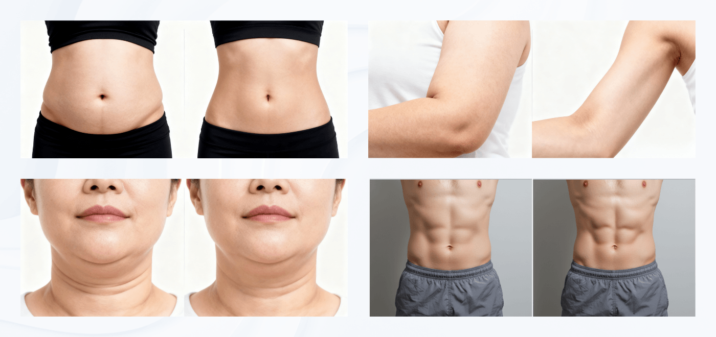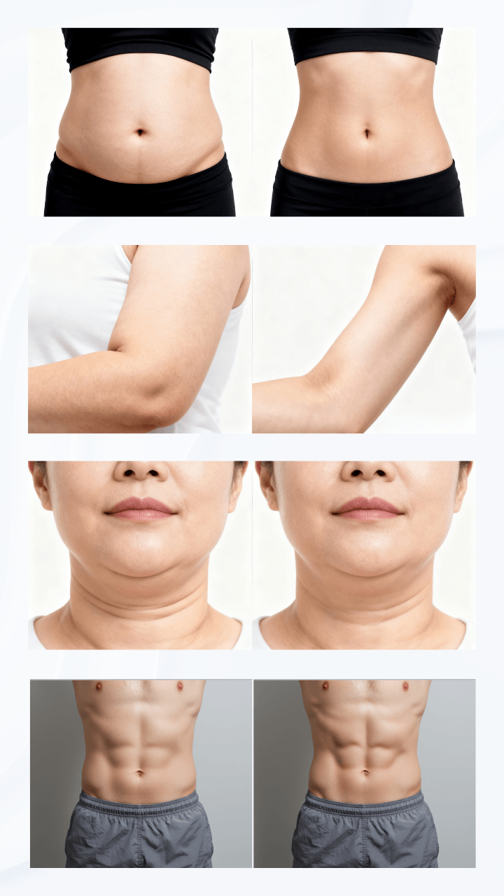 Targets and eliminates stubborn fat deposits in specific body regions like abdomen, thighs, arms, and chin