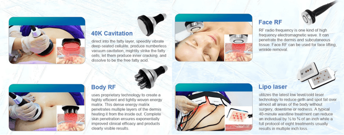 Cavitation, Body RF, Face RF, and Lipo Laser.