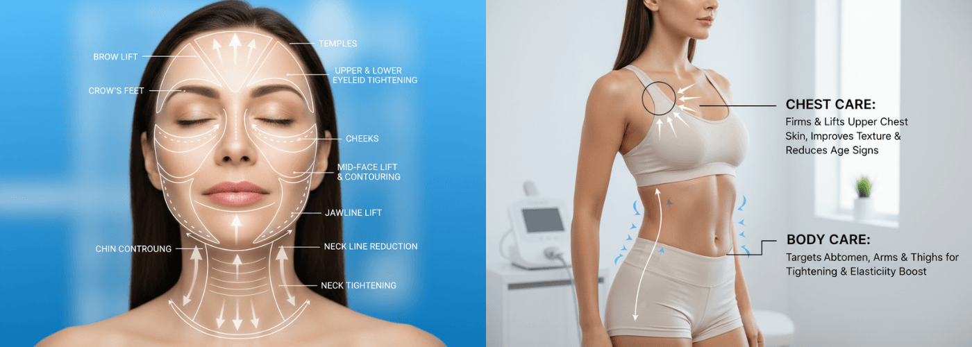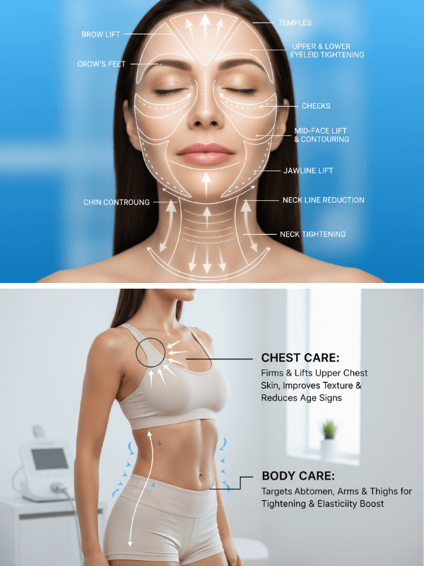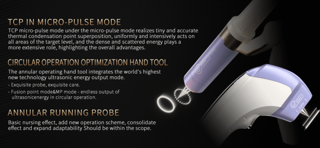 The Ultra-micro Pulsed Ultrasound Lifting System offers seamless, non-invasive skin tightening and lifting with industry-leading comfort and speed. Powered by a next-generation ultra-micro pulsed ultrasonic platform, this device applies an advanced combination of point, line, and surface technology—delivering full 360° multilayer treatment for lasting anti-aging effects. The multidimensional flat and circular handpieces cover both targeted and wide-area skin rejuvenation, precisely transmitting energy to the deep tissue layers for fascia tightening and collagen stimulation without damage to surrounding tissue. Smart interface, patented clinical ergonomics, and multiple probes for various treatment depths set new standards in safety, performance, and user experience.